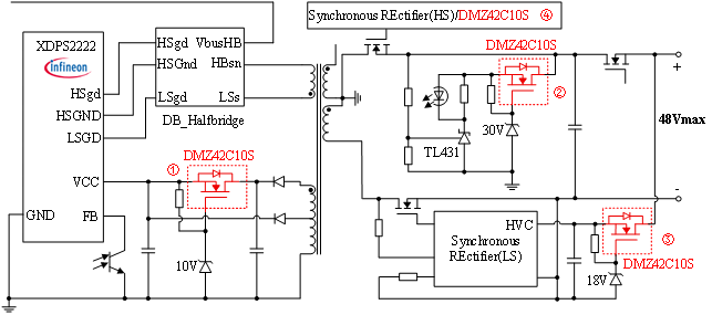 英飞凌在PD快充领域推出了数字混合反激(HFB)组合控制器(如XDPS2221、XDPS2222系列),配合CoolGaN™氮化镓器件,构成了面向140W/240W级别快充的成熟解决方案。在其参考设计中,特别是支持48V高压输出的方案里,主控IC(如XDP2222)、同步整流IC以及保护电路(如TL432)的辅助供电环节,均采用了耗尽型MOSFET构建线性稳压电路。这一设计可直接利用耗尽型MOSFET在高压输入下实现稳压功能,同时有助于降低电路静态功耗。